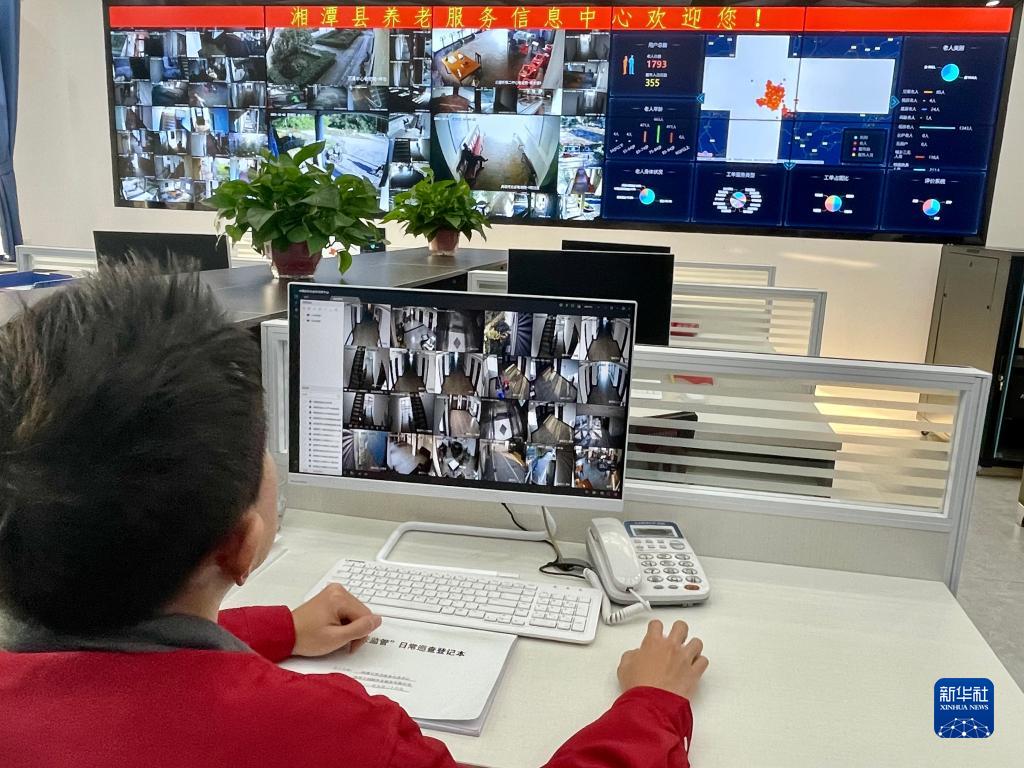 湖南省湘潭县养老服务信息中心工作人员在工作中(2021年12月2日摄)。紧急情况下,养老服务信息中心能为佩戴智能手环的老人提供及时服务。