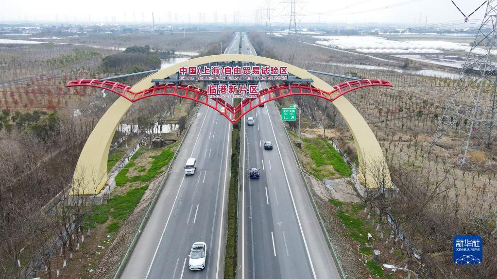 S2沪芦高速上的中国(上海)自由贸易试验区临港新片区“海鸥门”(2022年2月10日摄,无人机照片)。新华社记者 方喆 摄