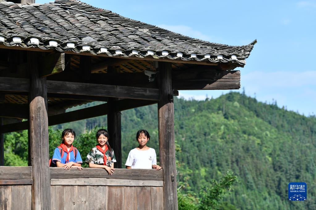 2021年6月25日,在从江县丙妹镇大歹苗寨,潘雪菲(中)与小伙伴们在村里的鼓楼上留影。新华社记者 杨文斌 摄