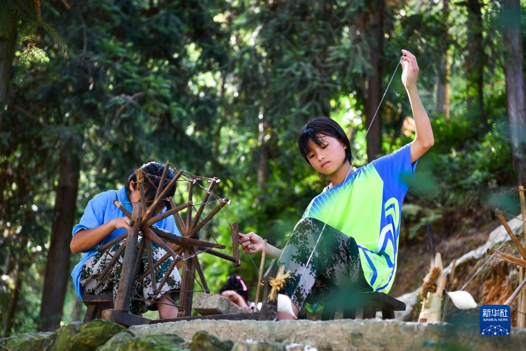 2021年8月20日,在大歹苗寨,潘雪菲(右)与小伙伴在学习纺线。新华社记者 杨文斌 摄