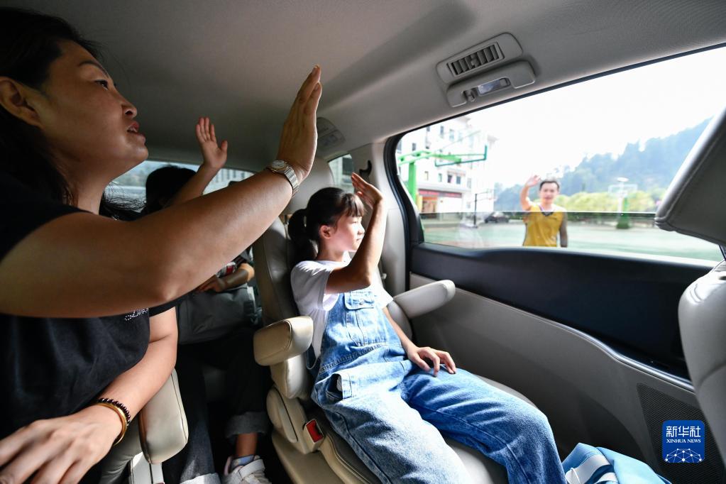 2021年8月21日,在离开苗寨前往贵阳的车上,潘雪菲与大歹小学的老师挥手告别。新华社记者 杨文斌 摄