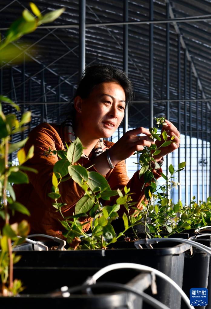 3月3日,在乳山市城郊特色农业产业示范区,工作人员在管护蓝莓。