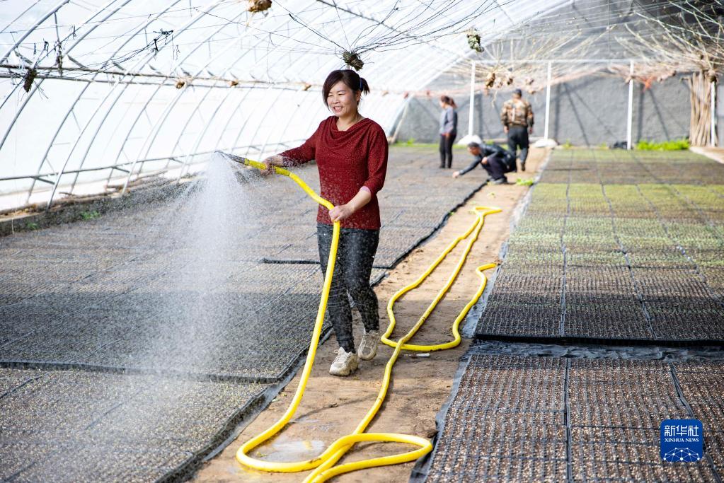 3月8日,农民在宁夏贺兰县隆源村的蔬菜种植园区育苗棚内劳作。