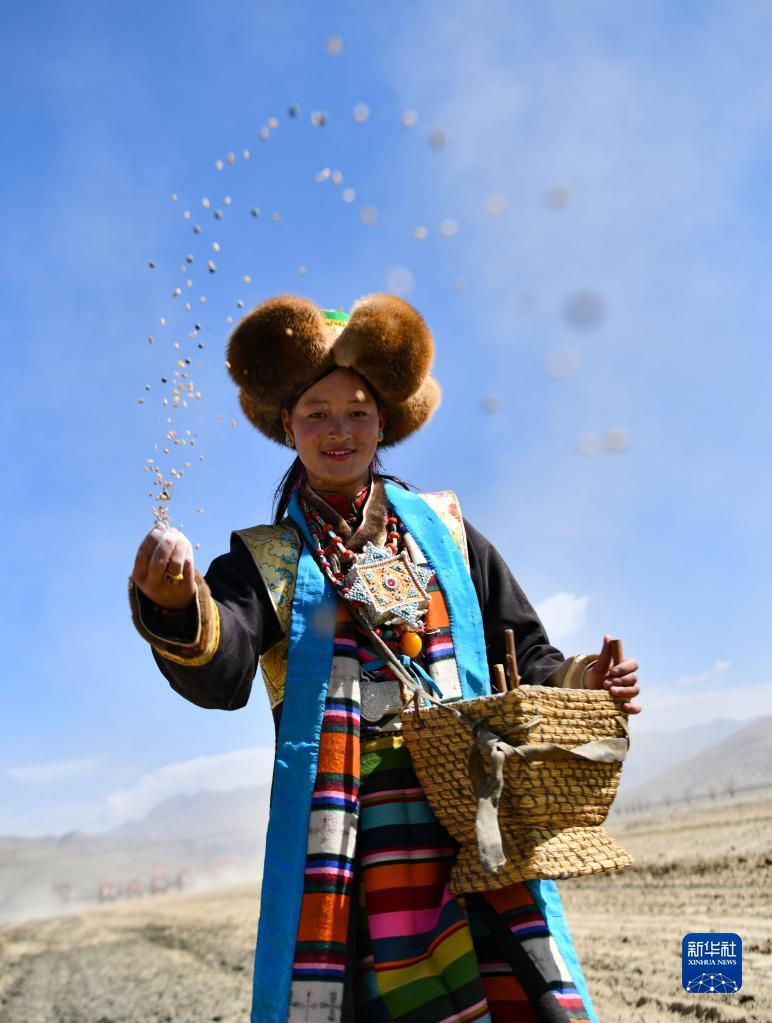 村民在西藏日喀则市江孜县努康村参加春耕仪式时播撒种子(3月16日摄)。