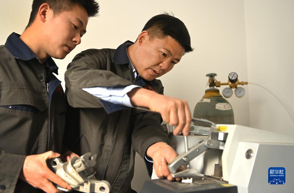 3月26日,王江鹏(右)在实验室分析材料的成分,以确保产品质量的稳定性。今年41岁的王江鹏2020年6月返乡创办景鹏电力科技有限公司,目前已建成生产线3条,实现年产值4000余万元,为当地群众就业、财政税收做出了贡献。新华社记者 陶明 摄