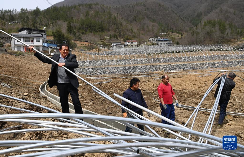 3月27日,在镇坪县钟宝镇三坪村,冯成玖(左一)与村民一起搭建大棚。53岁的冯成玖今年回到村里流转山地,准备培植中药材,带领村民共同致富。新华社记者 陶明 摄