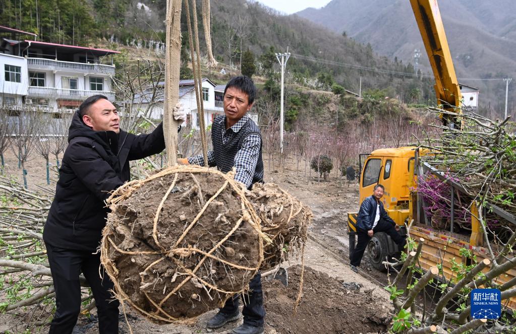 3月27日,镇坪县钟宝镇东风村村民夏云泉(左一)在山坡上移栽花木。一直在外地从事建筑业的夏云泉,今年回到村里,带动村民发展苗木产业。新华社记者 陶明 摄