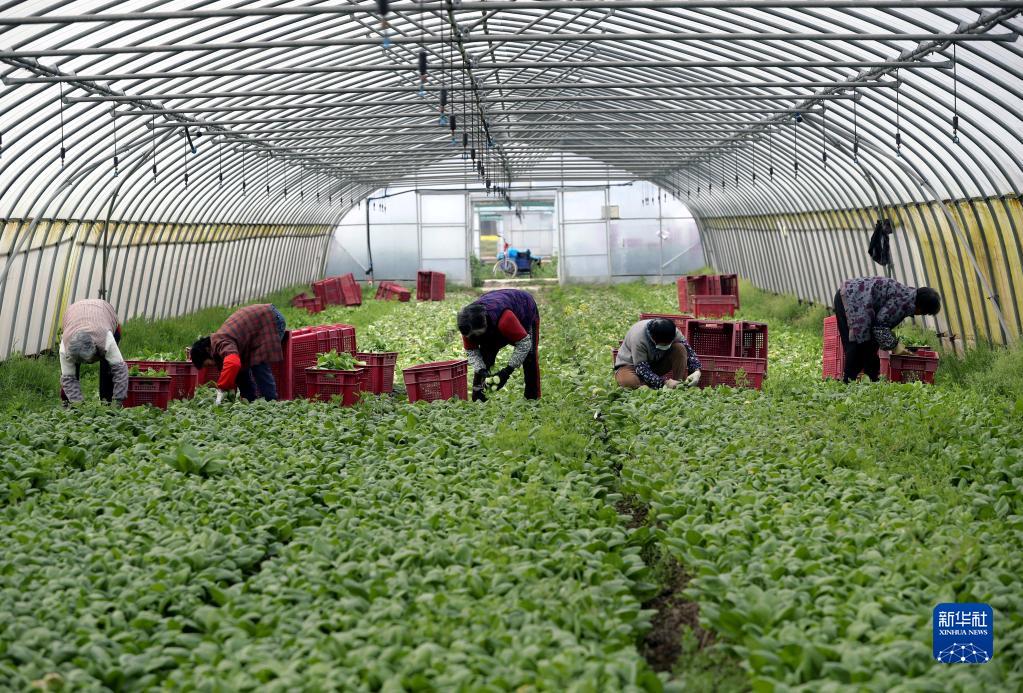 3月30日清晨,在青浦区朱家角镇安庄村,上海世鑫蔬菜种植专业合作社的工人在采摘蔬菜。