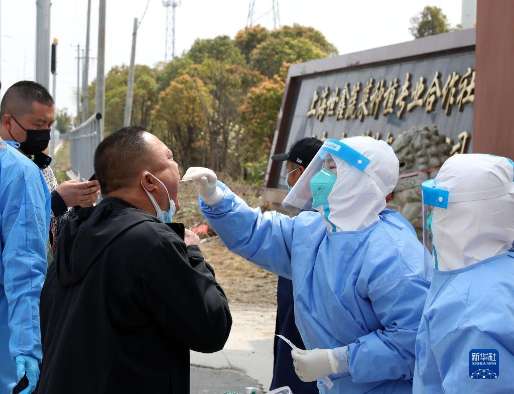 3月30日,朱家角镇组织医护人员上门为世鑫蔬菜合作社的工人进行核酸检测采样。 新华社记者 刘颖 摄