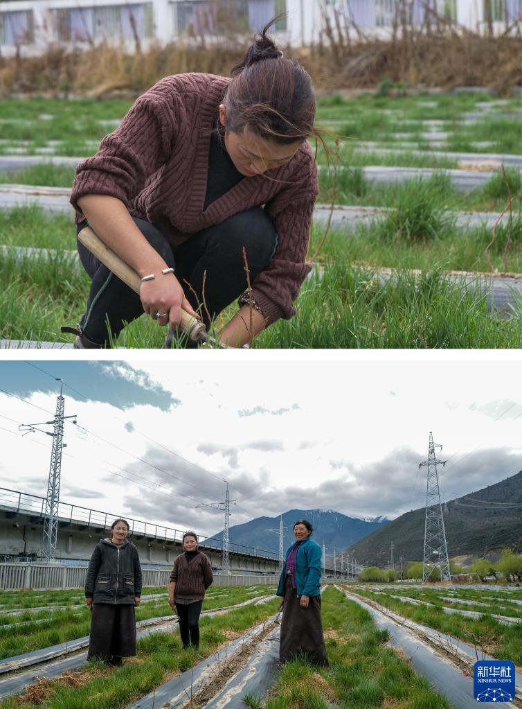 拼版照片:上图为3月30日,尼玛德吉在蓝莓种植基地工作;下图为尼玛德吉(中)及同事站在蓝莓种植基地中,背后是铁路桥。麦巴村村民尼玛德吉今年刚满20岁,此前在林芝巴宜区一家藏餐馆打工,后来回到村里设立的蓝莓种植基地工作。尼玛德吉说,能在家门口工作令她很开心,她每天都能看到火车从旁边经过,希望有一天也能坐上火车去拉萨逛一逛。