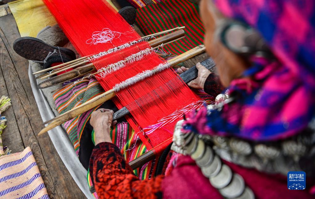 今年72岁的本央老人,是僜人服饰制作技艺西藏自治区级非遗传承人。在西藏林芝市察隅县沙琼村,老人身着传统的僜人服饰,在自家的凉亭里编织布料。