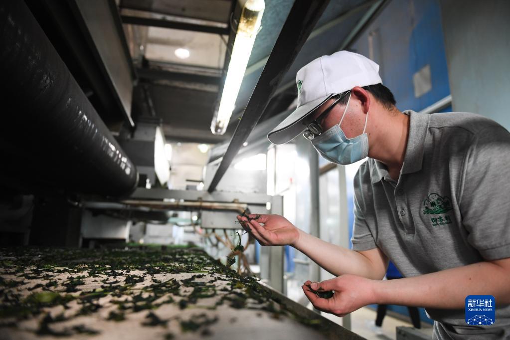 4月20日,工人在现代化生产线上查看茶叶烘干情况。