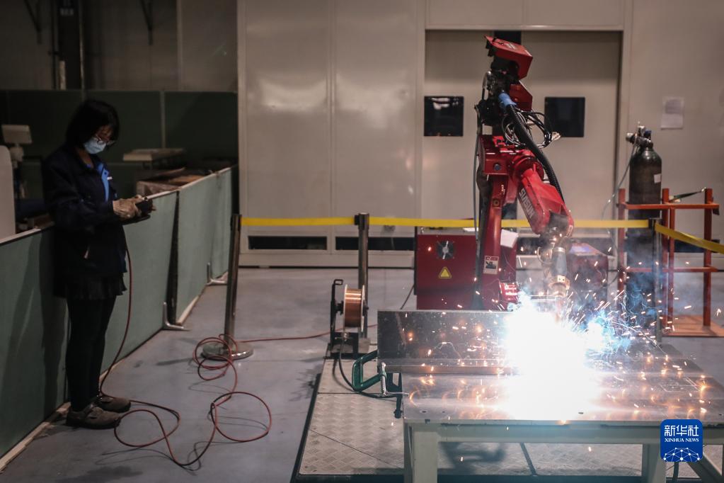 4月28日,新松机器人自动化股份有限公司的工作人员在生产车间内调试机器人。