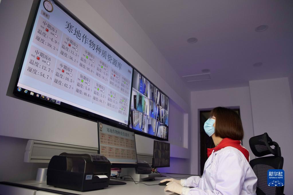 5月19日,工作人员在黑龙江寒地作物种质资源库内查看库内情况。