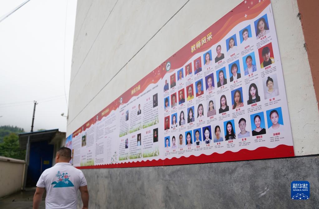 5月28日,韩富走过校内展示墙,上面展示着如今在校的41名教师的照片。