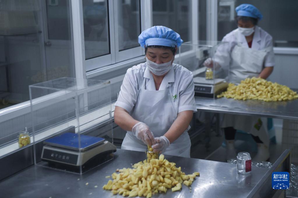 6月21日,嘉兴市新丰生姜开发有限公司的工人在流水线上罐装生姜。