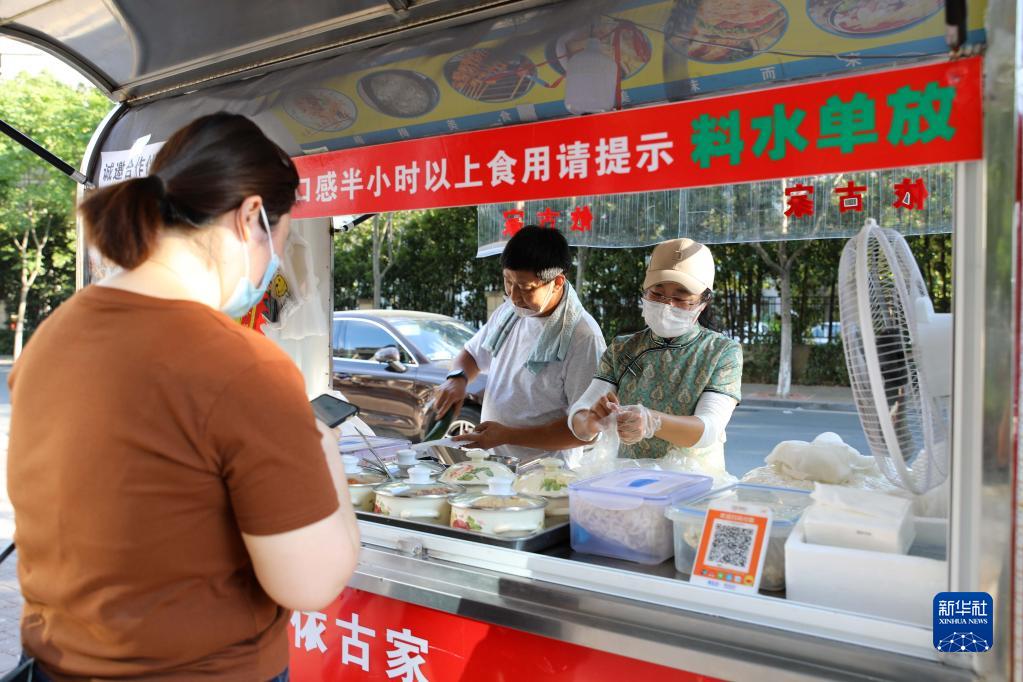 6月21日,顾客在朱艳的凉皮摊前排队等候。新华社记者 曹力 摄