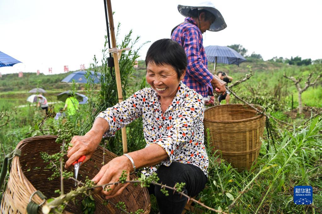 6月21日,在永川区板桥镇通明村花椒种植基地,妇女们在采收花椒。