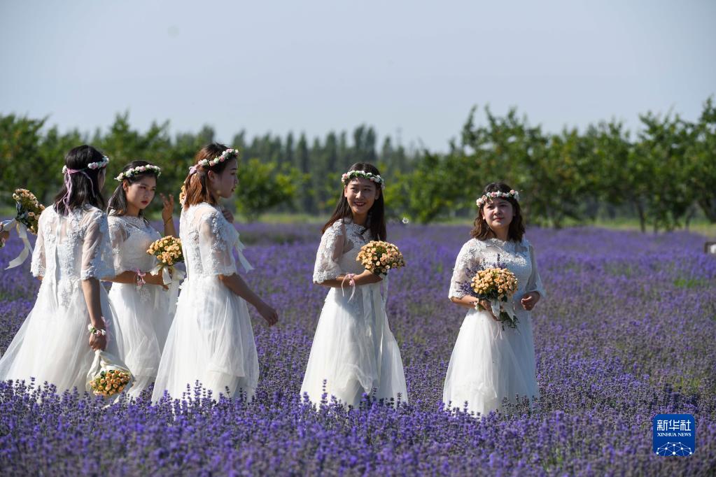 6月22日,当地评选的薰衣草形象大使行走在新疆霍城县四宫村薰衣草花田里 。