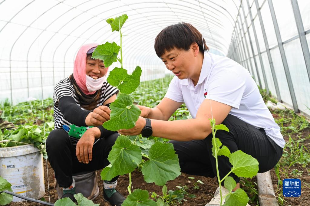 6月22日,齐晓景(右)在合作社大棚里指导农户种植。
