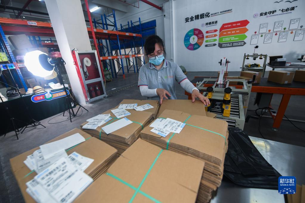 6月27日,在义乌市苏溪镇爱德玛电商园的“小众云仓”站点内,工作人员在进行发货前的准备。