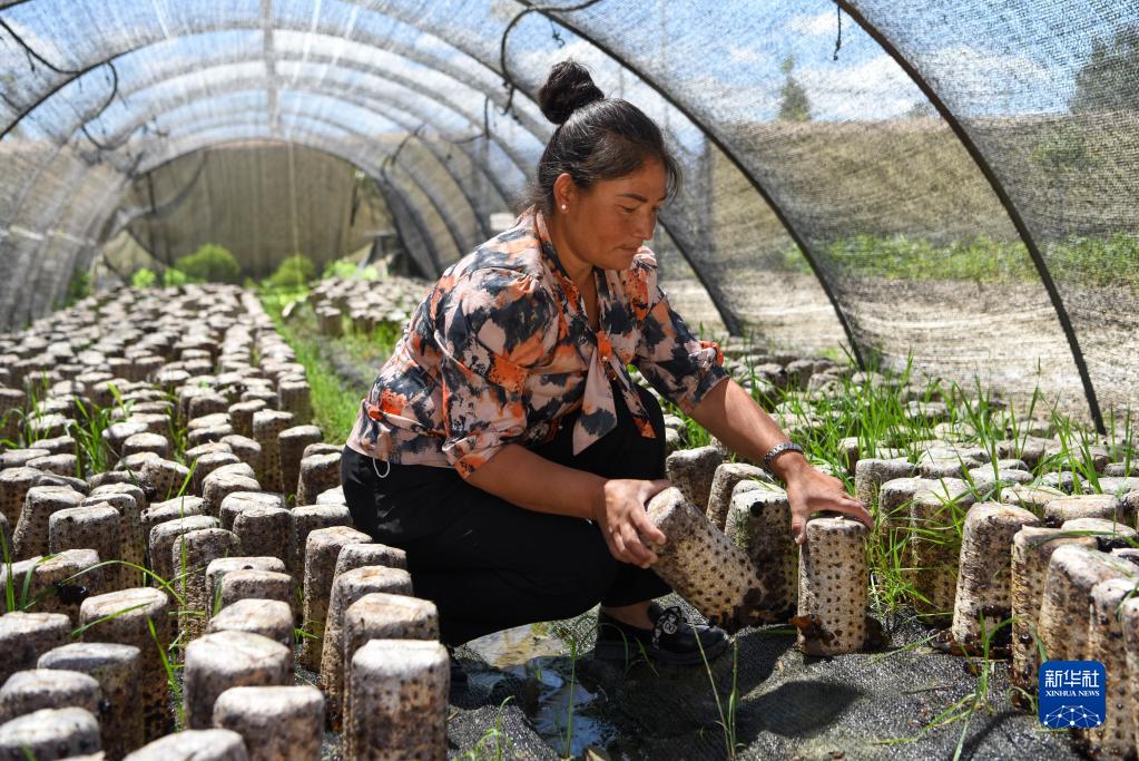 新疆乌什县依麻木镇托万克麦盖提村村民在查看黑木耳菌棒(6月7日摄)。