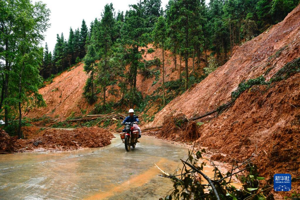 6月28日,一辆摩托车经过从江县城至丙妹镇大洞村的公路,这条公路经过抢修后已经可以通行。