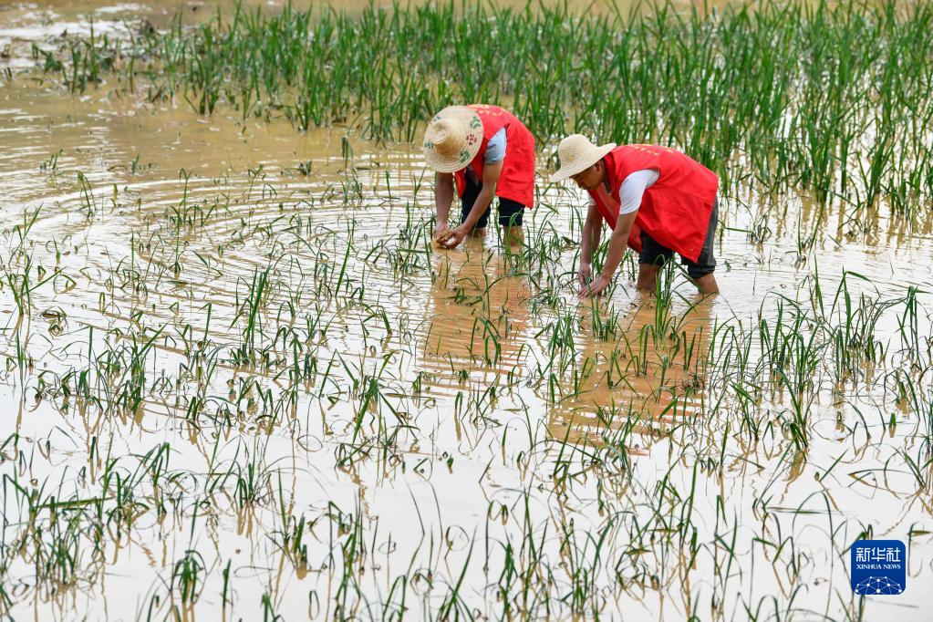 6月28日,在从江县丙妹镇大洞村,志愿者帮助村民整理受灾的秧苗。