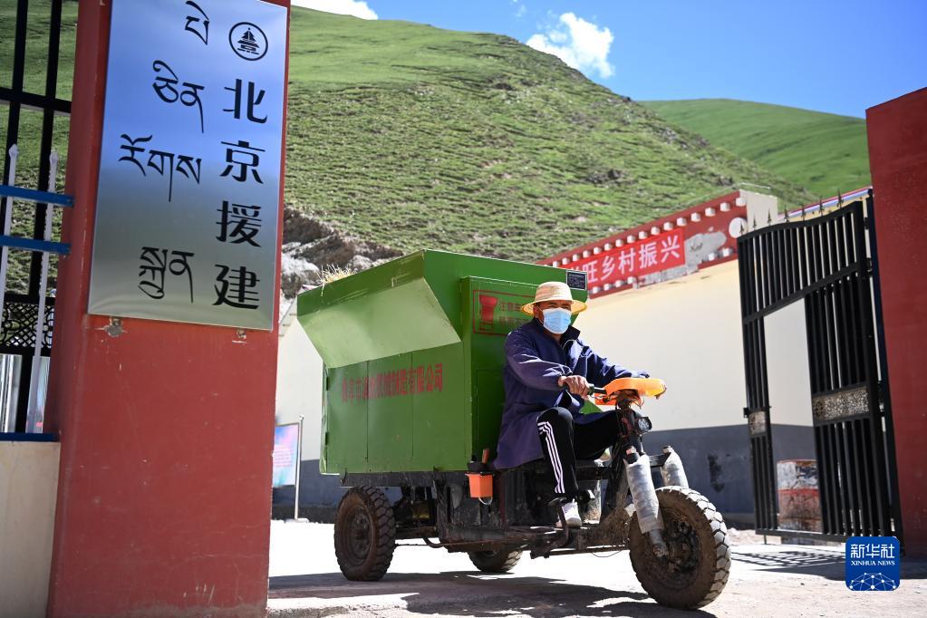 在称多县歇武镇牧业村的牦牛养殖基地,工作人员驾驶自动撒料车驶向牛舍(7月4日摄)。
