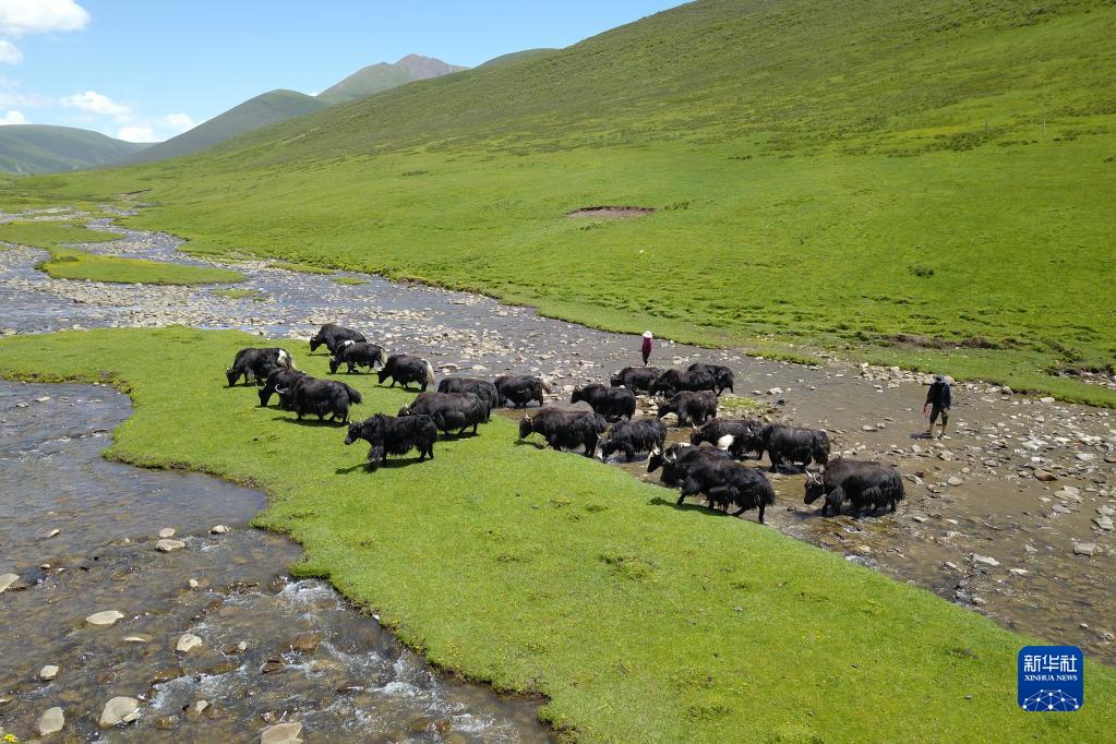 在称多县歇武镇牧业村,牦牛在河道中饮水(7月4日摄)。
