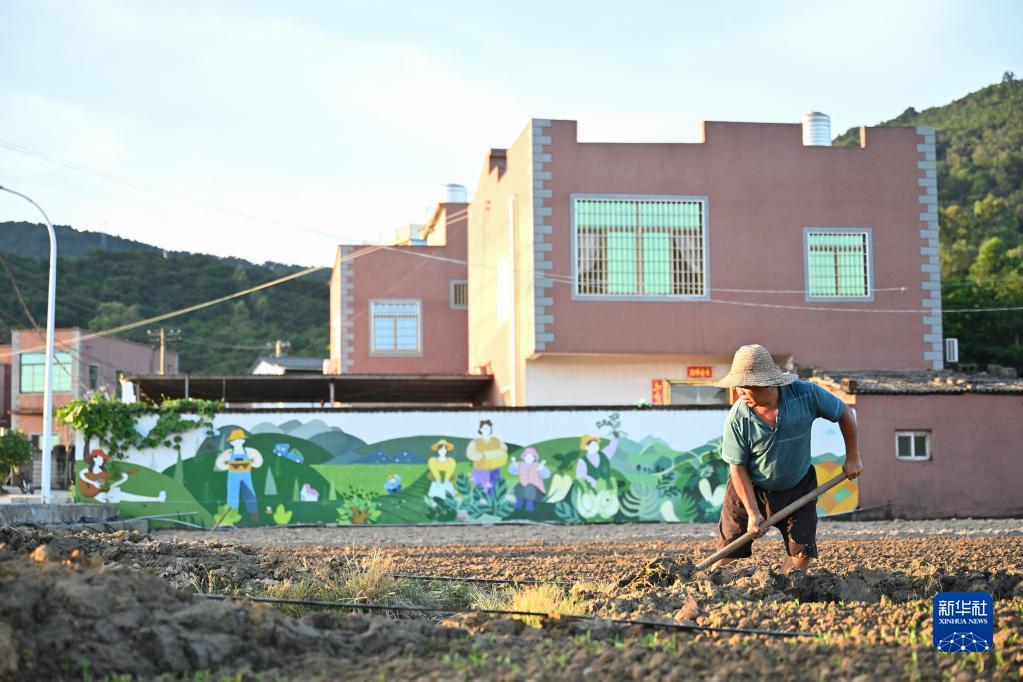 7月11日,在厦门市海沧区东孚街道赤土社,村民在彩绘墙前的田地里劳作。