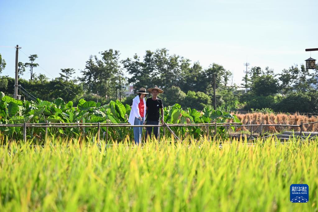 7月11日,在厦门市海沧区东孚街道赤土社,李佩珍(左)在田野里和村民查看水稻种植情况。
