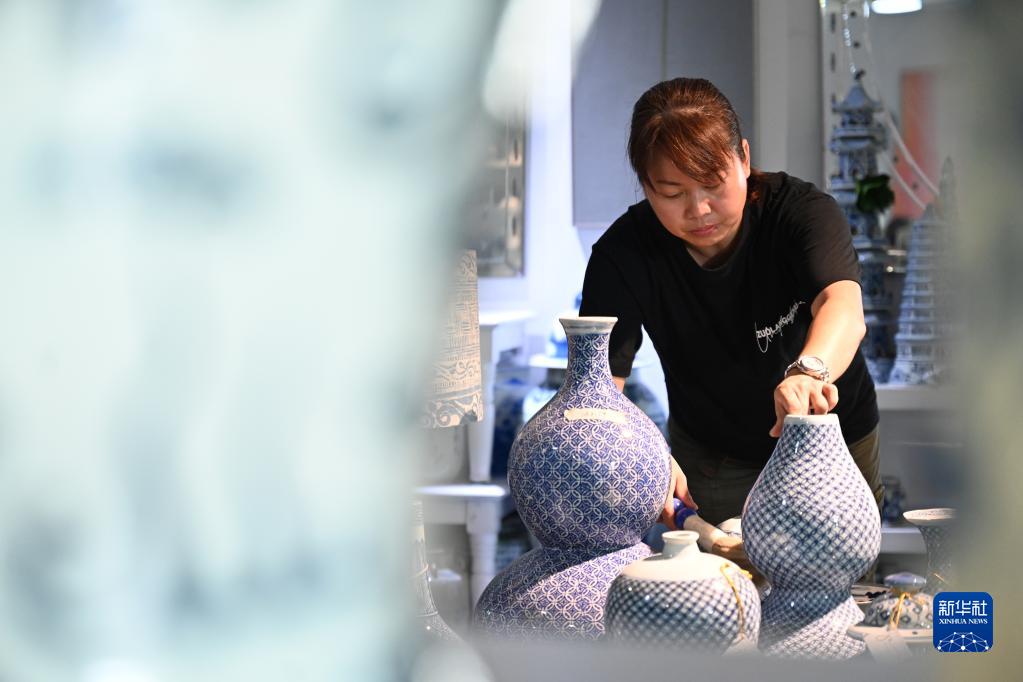 7月11日,在厦门市海沧区东孚街道赤土社云溪轩陶艺馆,工作人员在摆放陶瓷。