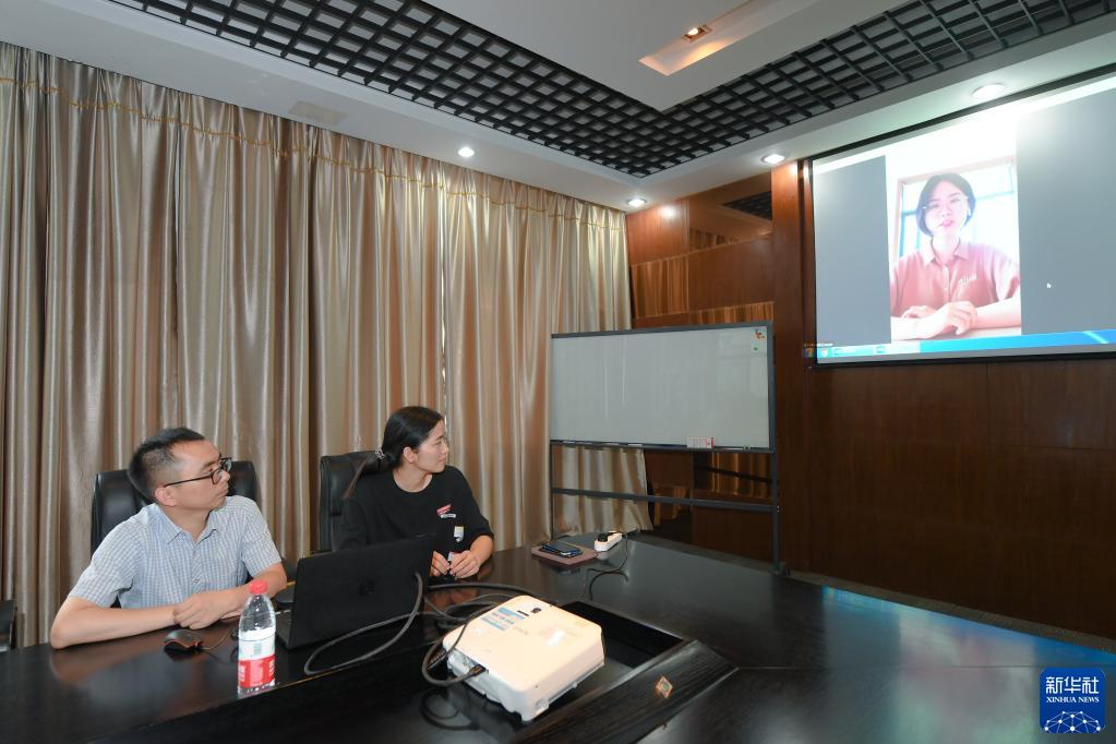 7月19日,在位于吴兴区埭溪镇的一家油墨公司,企业相关负责人和应聘者视频连线,进行线上招聘。