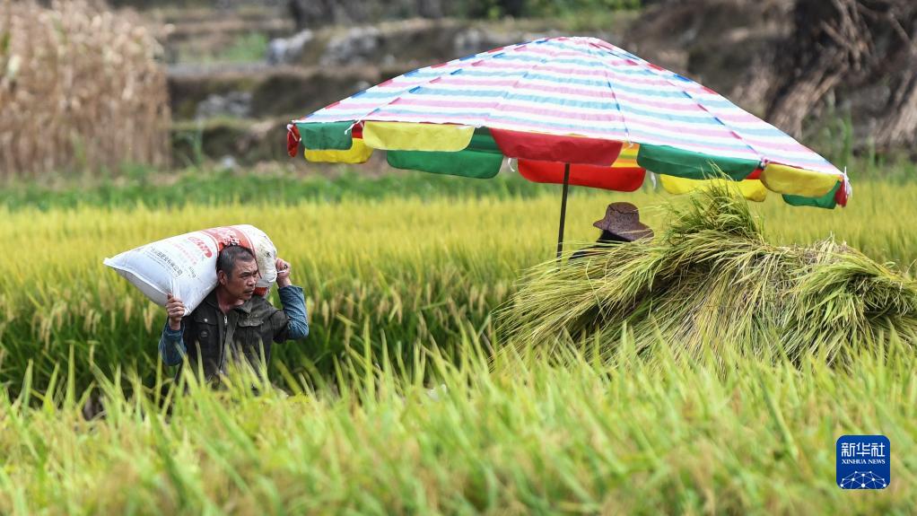 7月20日,在大化镇鸣凤村,当地农民在收获早稻。新华社记者张爱林摄