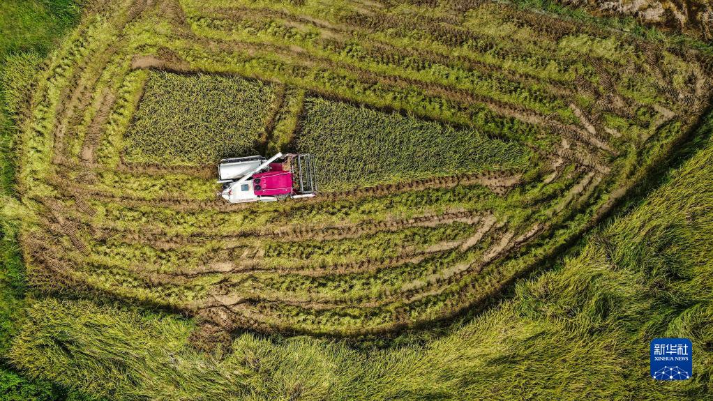 在大化镇龙口村富硒水稻种植基地,农民在抢收早稻(7月20日摄,无人机照片)。新华社记者张爱林摄