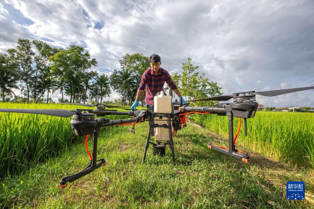 8月1日,尼空在泰国黎逸府检查大疆农业植保无人机。新华社记者 王腾 摄
