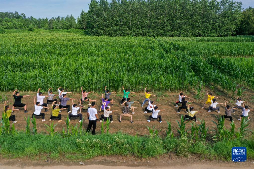 刘龙(前)带领孩子们在农田里练武术(无人机照片,8月16日摄)。