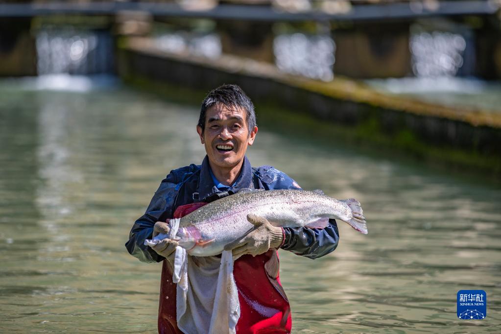 10月11日,在重庆市城口县蓼子乡明安村冷水鱼产业基地,工作人员在展示刚刚捕捞的虹鳟鱼。新华社记者 黄伟 摄