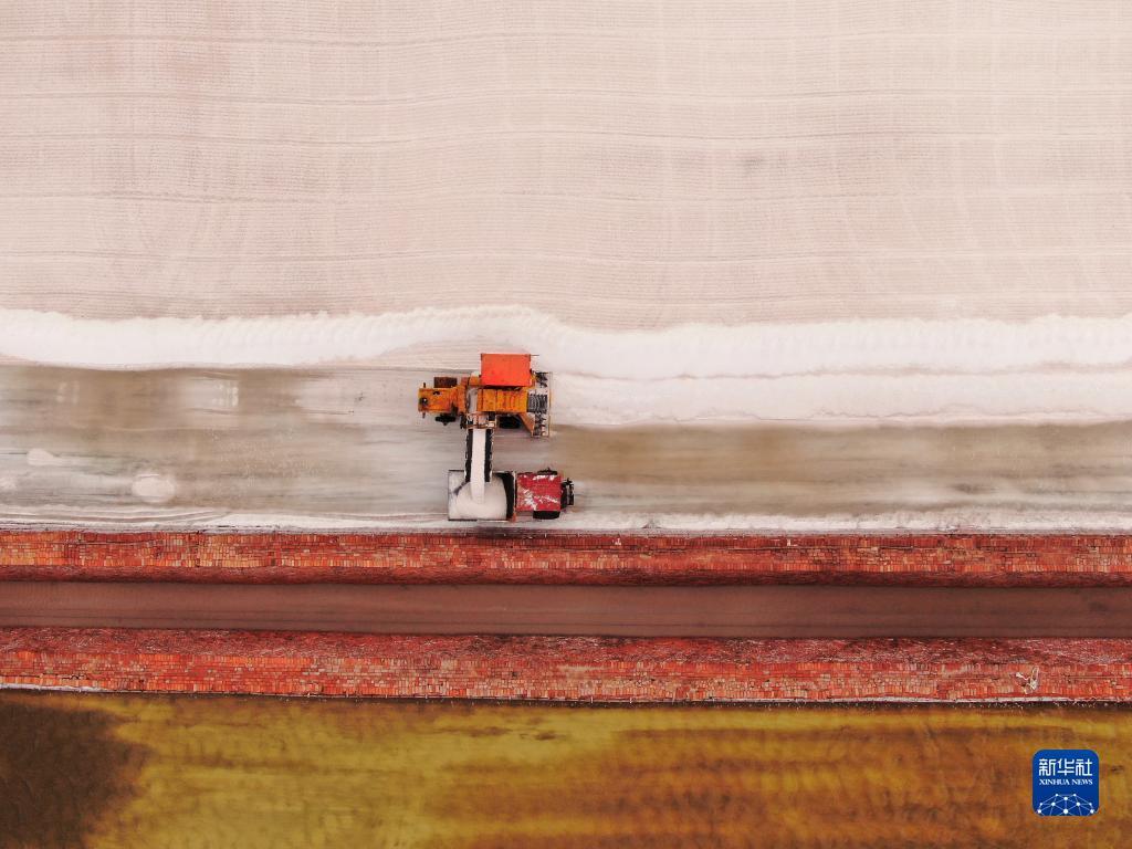 10月27日,在山东省滨州市沾化区滨海镇金盛海洋盐场,工人在收获秋盐(无人机照片)。