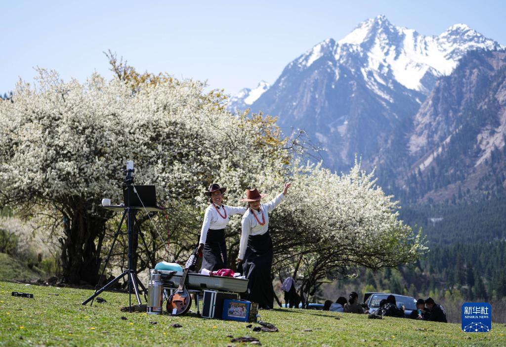 4月25日,四川省九寨沟县漳扎镇中查沟村民在草甸上直播。