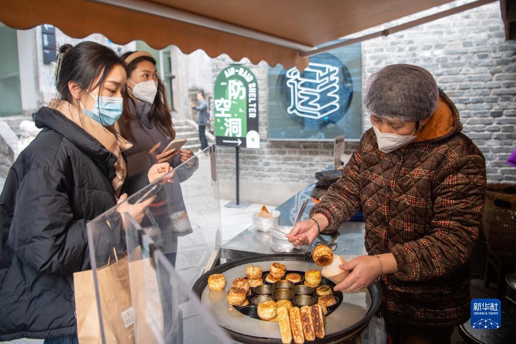 12月24日,在位于重庆解放碑商圈的著名景点山城巷,游客购买当地特色小吃。