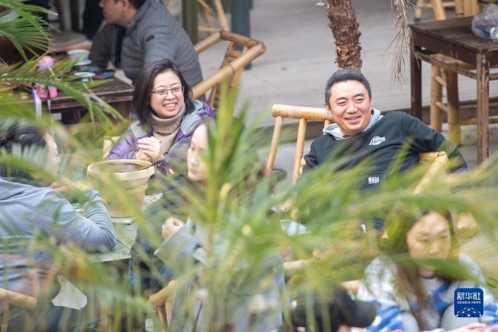 12月24日,市民游客在位于重庆解放碑商圈的著名景点山城巷一家店内聊天休息。