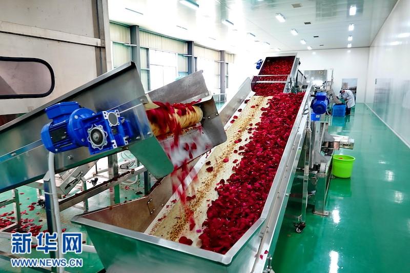 美栖村种植的食用玫瑰品种为“墨红”,花期可以从4月份延续至11月份,平均1亩花田能产1吨鲜花瓣,花期长、产量高、品质优,具备工业化加工生产的条件。在自动化深加工厂里,数道加工流程为玫瑰产品锁“鲜”保质。“工人一般从凌晨到上午九点采摘玫瑰花,之后鲜花统一送入冷库保鲜。加工时,无菌车间的自动化生产线上会进行清洗和激光筛选等流程,再通过先进的低温冷凝提取技术,将玫瑰花制成一系列的产品。”加工厂相关负责人表示,自动化生产能够最大限度地“锁住”玫瑰花的品质,让深加工产品在市场上更具竞争力。