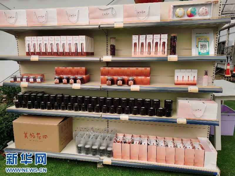 在美栖村园艺中心的展示架上,现烤鲜花饼、玫瑰花苞水、玫瑰红茶、花骨朵茶、玫瑰酱、玫瑰超微粉等玫瑰花衍生品琳琅满目。“我们的鲜花饼有个很好听的名字,叫‘朝花夕食’,”宗华东指着鲜花饼解释道,“它的意思是凌晨采摘的鲜玫瑰,日落时分就能品尝到。”
