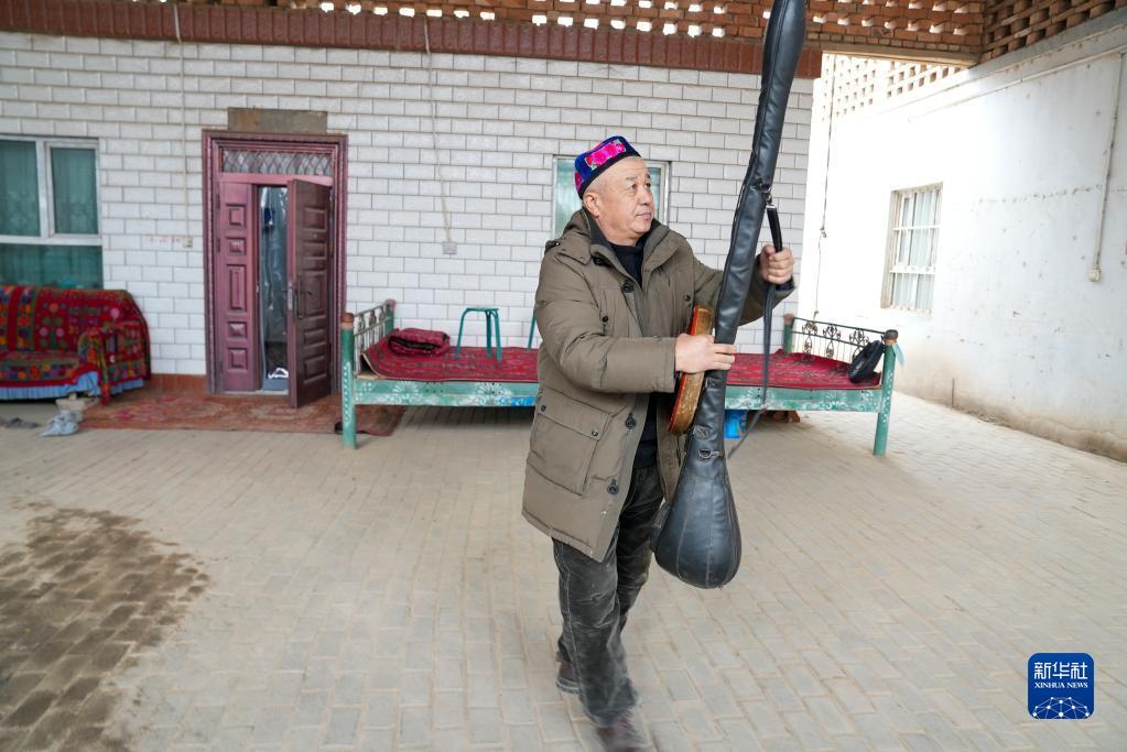 1月11日,在鄯善县鲁克沁镇木卡姆村的家里,苏来曼·阿不都拿着心爱的乐器准备去参加一场文艺演出活动。