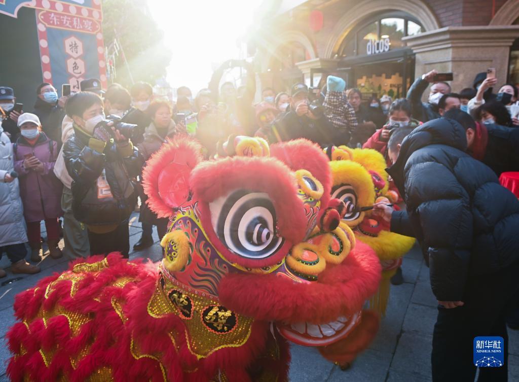 1月16日,在新登镇宋韵文化特色街区,人们给舞狮队的狮子点睛。