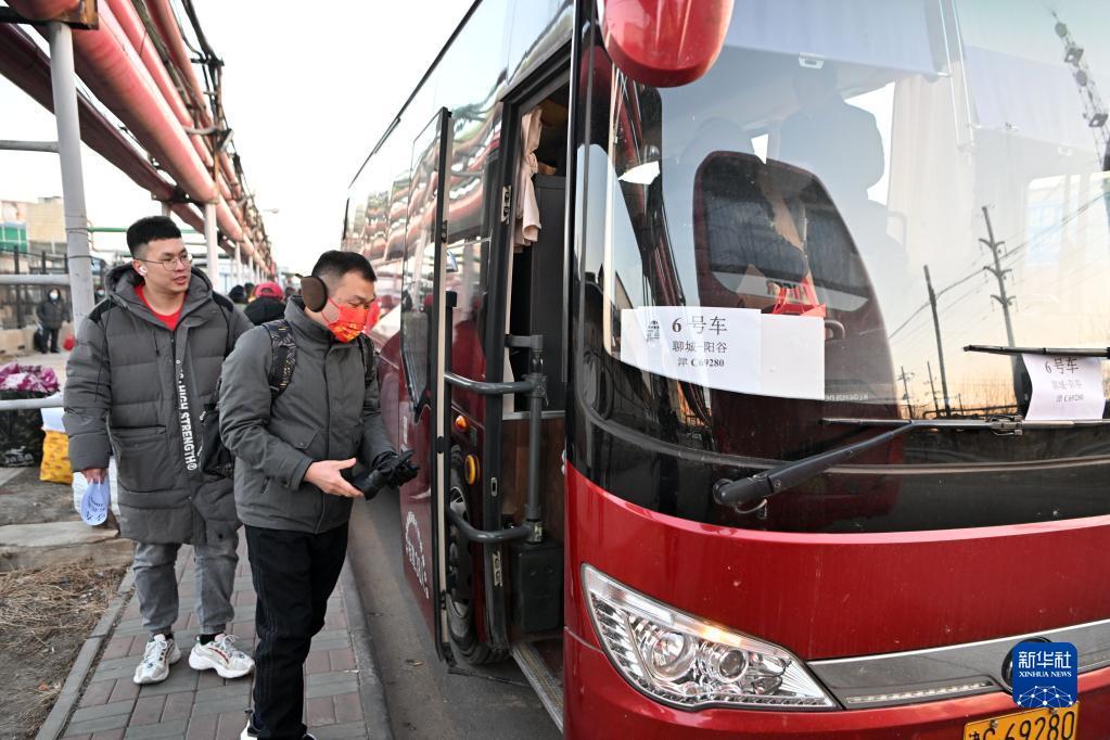 1月16日,返乡工人在天津市北辰区宜兴埠镇登车。