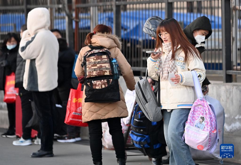 1月16日,返乡工人在天津市北辰区宜兴埠镇等待车辆到达。