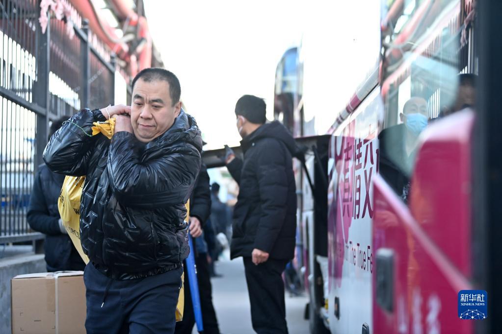 1月16日,返乡工人在天津市北辰区宜兴埠镇准备登车返乡。